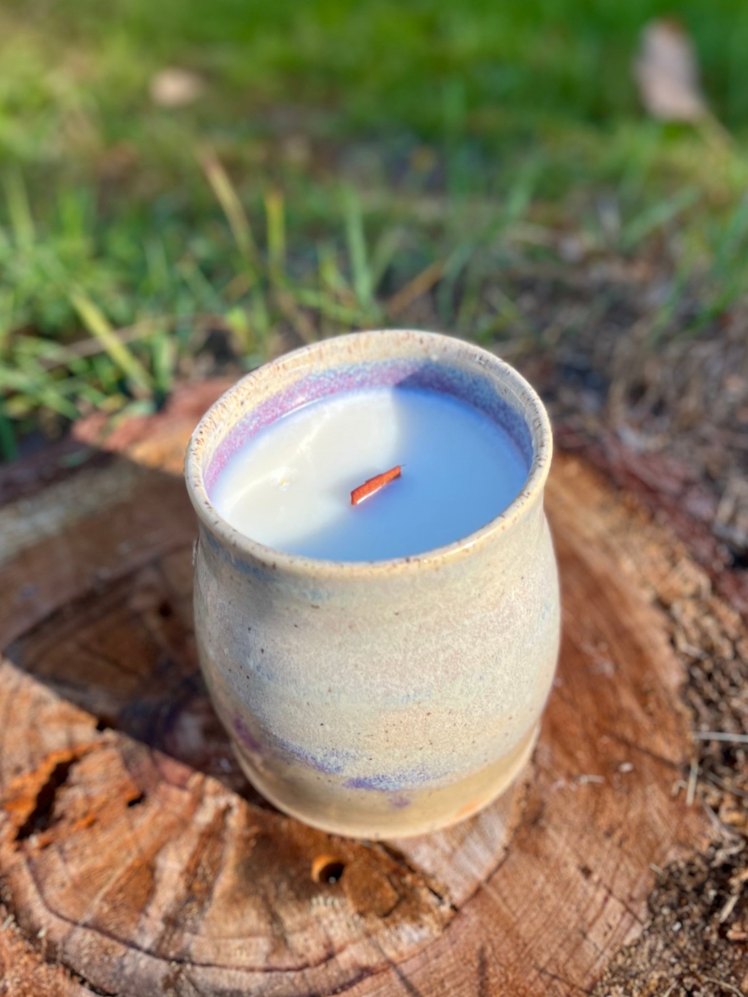 3 - sunset purple: warm sand with blue and purple swirls, smooth finish with thumbprint