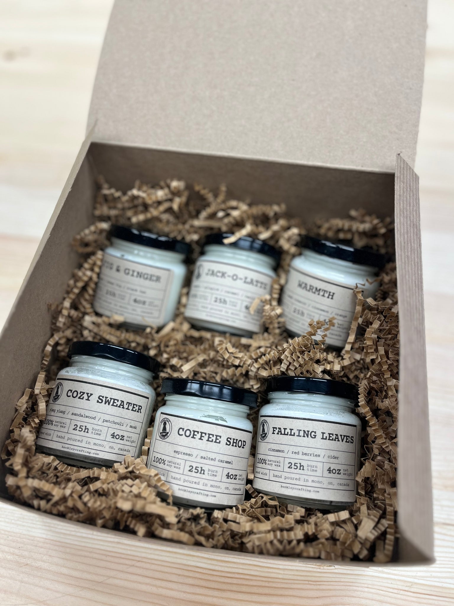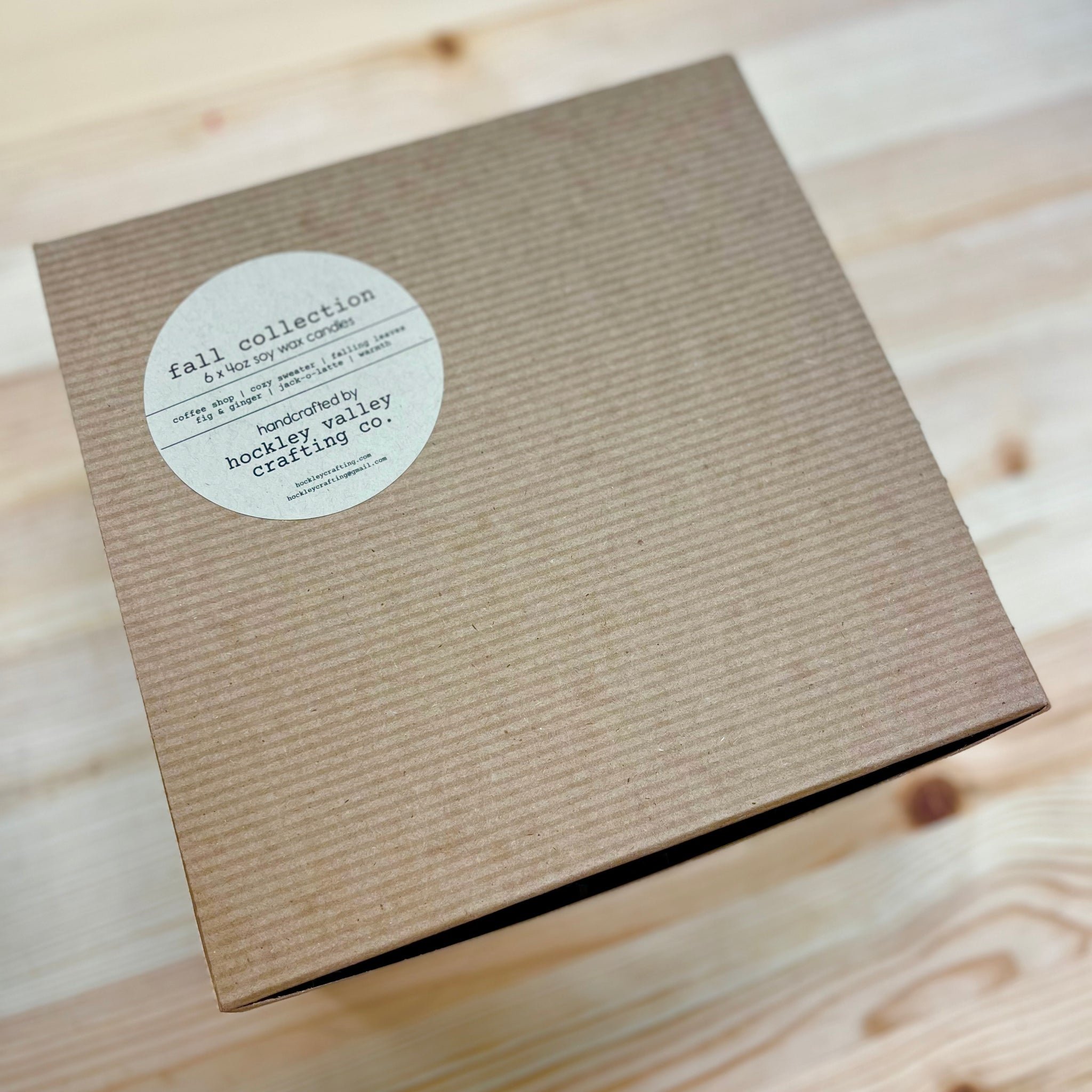 Includes 6 x 4oz wood wick candles for each scent in the fall collection.