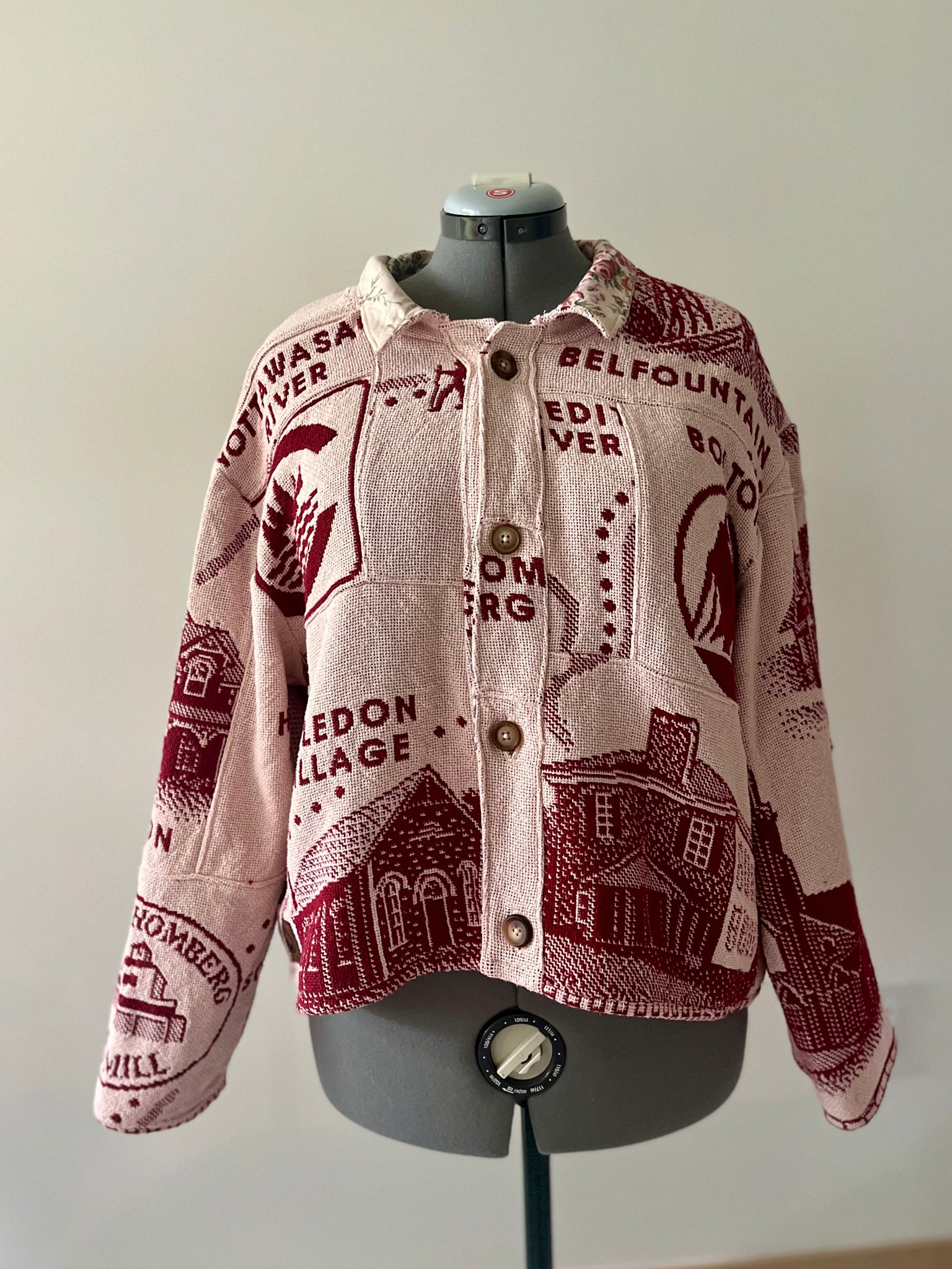 Upcycled from an extremely unique tapestry blanket featuring community motifs from in and around the northern peel region. The blanket was cut into patches and carefully sewn back together to highlight the woven images.